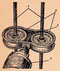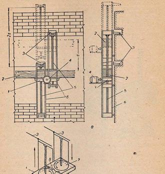 винт 7 в неподвижной теперь гайке 5, поднимают и закрепляют его на следующей позиции. Процесс подъёма опалубки повторяется. Поднимая каждую раму опалубки своим домкратом, осуществляют общее перемещение опалубки вверх для бетонирования следующего слоя. Способ подъёма груза поступательным перемещением вращающейся гайки на неподвижном винте используется в механизированных подмостях на шагающих домкратах, применяемых при строительстве кирпичных зданий. Шагающие винтовые домкраты состоят из двух подвижных рам 6, в центре которых закреплены грузоподъёмные винты 5. В верхней части подвижных рам шарнирно закреплены опорные лапы 3. Подвижные рамы перемещаются по вертикали в направляющих грузоподъёмной обоймы 1. В этой же обойме крепятся пристенные брусья подмостей 2 и редукторов с приводным электродвигателем 4. Редуктор шагающего домкрата состоит из двух червячных шестерен-гаек 2, находящихся в зацеплении с червяком 3, приводимым во вращение от электродвигателя 4. Во внутреннюю резьбовую часть шестерни ввинчены винты 1 подвижных рам домкрата. При работе электродвигателя шестерни-гайки, вращаясь в противоположные стороны, заставляют поступательно перемещаться винты с подвижными рамами. Если рамы не будут ни во что упираться, то один винт будет перемещаться вверх, а другой – вниз.