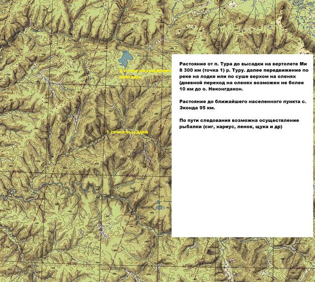 Маршрут Эконда оленеводческая бригада Вид тура – активный, сплав Категория сложности – экстремальный туризм Район проведения – Красноярский край, Эвенкийский муниципальный район, р. Нижняя Тунгуска, река Чина. Время действия – 01 июня – 20 сентября Протяженность маршрута – 160 км. Средства передвижения – вертолет Ми 8; резиновые лодки Silver, лод. мотор Меркурий-15; олени. Количество дней – 8 дней и 7 ночей Число туристов в группе – от 4 до 8 человек Приготовление пищи на активной части маршрута – сопровождающими на базе, Проживание на активной части маршрута – в гостинице (1 ночевка в Туре, далее в оленеводческой бригаде на охотничьих базах, при переходах возможно в палаточном лагере). Бронирование маршрута - 30 дней до выхода на маршрут