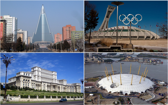 В 1984 году Николай Чаушеску, диктатор Румынии, решил, несмотря на бедность страны в области здравоохранения, образования и обеспечения продовольствием, построить гигантский дворец, самый большой в Европе Дом правительства. В 1989 году Чаушеску был казнен, а огромное здание осталось. Новое правительство решило его использовать по-прежнему, хотя занимает всего треть помещений. Это одно из бессмысленных строений, содержание которого лежит на плечах налогоплательщиков. 2. Купол тысячелетия (О2 Арена)