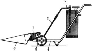 Машина комплектуется четырьмя газовыми баллонами вместимостью по 50 л, размещаемыми на двух тележках. Каждая тележка имеет ложементы для двух баллонов и защитный кожух. Баллоны соединяются с газопроводом машины гибкими шлангами. При передвижении машины горелочный блок с пятью горелками подправляет покровный слой мастики по всей ширине рулонного материала 6, раскатываемого рулон укладчиком по поверхности основания кровли.