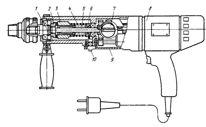 Электрические ломы предназначены для разрушения бетона, железобетона, кирпичной кладки, асфальтобетона, каменистого и мерзлого грунтов. Они аналогичны по конструкции электрическим молоткам и отличаются от них энергией удара и мощностью приводного электродвигателя. Энергия удара лома не менее 40 Дж, частота ударов 19...20 Гц. Электрические и электромагнитные перфораторы представляют собой универсальные машины многоцелевого назначения, которые предназначены для прорезки отверстий и проемов в междуэтажных перекрытиях и перегородках зданий при монтаже трубопроводов и вентиляционных систем, для пробивки борозд (штраб) для скрытой проводки и очистки поверхностей в конструкциях из искусственных и естественных строительных материалов, разрушения горных пород, а также сверления отверстий в различных материалах, установки дюбелей, завинчивания винтов и шурупов, рубки металла, обработки дерева и других работ. Перфораторы отличаются от молотков тем, что кроме ударного узла имеют механизм вращения сменного рабочего инструмента — бура, сверла, отвертки и др. Различают перфораторы электрические и электромагнитные. Конструкция и принцип действия ударных механизмов соответственно у электрических и электромагнитных молотков и перфораторов аналогичны. Для выполнения различных технологических операций перфораторы комплектуются сменными рабочими инструментами, обеспечивающими их универсальность: шнековыми бурами, буровыми коронками, пиками, ломами, штрабниками, бучардами, зубилами, сверлами различных типов по металлу и дереву, зенкерами, топориками и стамесками для обработки дерева, приспособлениями для забивки дюбелей, завинчивания винтов и шурупов и др. Электрические перфораторы предназначены для работы в ударном, ударно-вращательном, вращательном режимах, а также в режиме винтоверта. Промышленность выпускает три модели электрических перфораторов с энергией удара 1...2 Дж, которые имеют единые конструктивные схемы и принцип работы и максимально унифицированы. Рассмотрим конструкцию и принцип действия электрических перфораторов (рис. 8.13). От однофазного коллекторного электродвигателя 9 с вентилятором приводятся в действие компрессионно-вакуумный, ударный и вращательный механизмы, помещенные в алюминиевом стволе с виброизоляцией. Корпус электродвигателя — пластмассовый и выполнен заодно с основной рукояткой 10 пистолетного типа, в которую вмонтированы выключатель 11, устройство для подавления радиопомех и кабельный ввод.