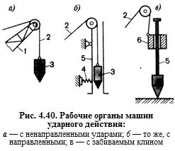 Рис. 8. Сверлильная машина ударно-вращательного действия (УВСМ): 1 – возвратная пружина; 2 – наковальня; 3 – ударник; 4 – рабочая пружина; 5 – шпиндель; 6 – подвижная втулка; 7 – переключатель скоростей; 8 – электропривод; 9 – двухскоростной редуктор; 10 – переключатель режима работы Резьбонарезные РМ используются для нарезания закрепленным в патроне метчиком внутренних резьб вновь, а также для прогонки испорченных резьб в стали, чугуне, алюминии во время монтажных работ. Отличием резьбонарезных РМ от сверлильных является наличие в приводе реверсивного двухскоростного редуктора для ускоренного (в два раза) вывинчивания метчика из нарезанного отверстия. Отечественные резьбонарезные РМ снабжаются набором метчиков диаметром 3... 14 мм. 5.Перечислите машины применяемые для разрушения прочных материалов? Как они устроены, как работают? Какими рабочими инструментами их комплектуют? Строительство в северных и северо-восточных районах нашей страны связано с существенным увеличением объемов разработки сезоннопромерзающих и вечномерзлых грунтов. Мерзлые грунты по сравнению с не мёрзлыми (талыми) характеризуются значительно большими сопротивляемостью разрушению (в 15...20 раз) и абразивностью (в 100...150 раз), трудоемкостью и стоимостью разработки. Производительность землеройных и землеройно-транспортных машин при разработке мерзлых грунтов резко снижается. В современном городском строительстве разработку мерзлых грунтов ведут в основном двумя способами — взрывным и механическим. Взрывной способ рыхления мерзлых грунтов применяется обычно при больших объемах работ на открытых, удаленных от сооружений площадках при глубине промерзания более 1 м. В последнее время взрывной способ находит применение в стесненных городских условиях с использованием локализаторов взрыва, не допускающих разлета кусков грунта и повреждения сооружений. Преимущественное распространение (более 80 % общего объема работ) получил высокоэффективный и универсальный механический способ разработки мерзлых грунтов с использованием специальных машин, условно подразделяемых на две группы: машины для подготовки (предварительного рыхления, нарезания на блоки) мерзлых грунтов и последующей окончательной разработки взаимодействующими с ними в комплексе землеройными машинами общего назначения; машины, самостоятельно выполняющие весь комплекс разработки до заданной отметки и эвакуации мерзлого грунта из забоя. К первой группе относятся навесные рыхлители на тракторах класса 10...50, машины ударного действия для рыхления грунта ударными импульсами, машины безударного действия для отрыва грунта от массива, баровые и диско фрезерные машины для нарезания щелей в мерзлых грунтах; ко второй — землеройно-фрезерные машины и траншейные цепные и роторные экскаваторы, рабочие органы и скоростные режимы которых приспособлены для разработки мерзлых грунтов с промерзанием на всю глубину траншеи. Машины ударного действия воздействуют на разрушаемую среду (мерзлый грунт, твердое дорожное покрытие, фундамент и т. п.) ударными импульсами свободно падающих или забиваемых рабочих органов. Самым распространенным видом свободно падающих рабочих органов являются клин-молоты конусообразной, пирамидальной и клиновидной форм массой 0, 5...4 т.