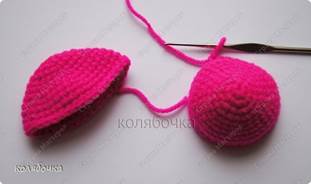 Уши (2детали) 1р - 6сбн в кольцо 2р - пр*6 (12) 3р - (1сбн, пр)*6 (18) 4-9р - 18сбн по кругу 10р - (7сбн, уб)*2 (16) 11р - 16сбн 12р - (6сбн, уб)*2 (14) 13р - (3сбн, уб)*2, 2сбн, уб (11) 14-15р - 11сбн 16р - (2сбн, уб)*2, 3сбн (9) 17-19р - 9сбн по кругу Оставить нить для пришивания.