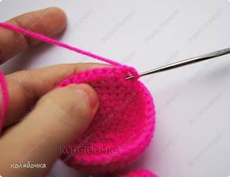 1р - 6вп в кольцо 2р - пр*6 (12) 3р - (1сбн, пр)*6 (18) 4р - (2сбн, пр)*6 (24) 5р - 24сбн по кругу 6р - (3сбн, пр)*6 (30) 7р - (4сбн, пр)*6 (36) 8-11р - 36сбн по кругу Отрезать нить. Связать точно такую ещё 1 деталь, нить у неё не отрезать.