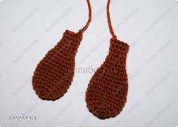 Задние лапы. 1 - 6 воздушных петель 2 - столбик без накида с двух сторон цепочки для образования овала ступни. (=12) 3 - С двух сторон прибавляем по 2 столбика, сохраняем овал (=16 ст) 4 - столбик без накида в каждый столбик (=16 ст) 5 - равномерно убираем 5 столбиков (=11 ст) 6 - равномерно убираем 3 столбика (=8 ст) 7 - столбик без накида в каждый столбик (=8 ст) 8 - добавляем 2 столбика (= 10) 9 - столбик без н6акида в каждый столбик (=10) Набиваем. 9 - убавляем 5 столбиков (= 5 ст) Закрепляем нить, оставляем 20 см.