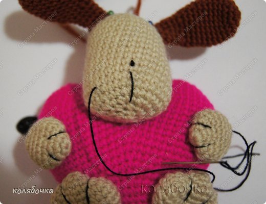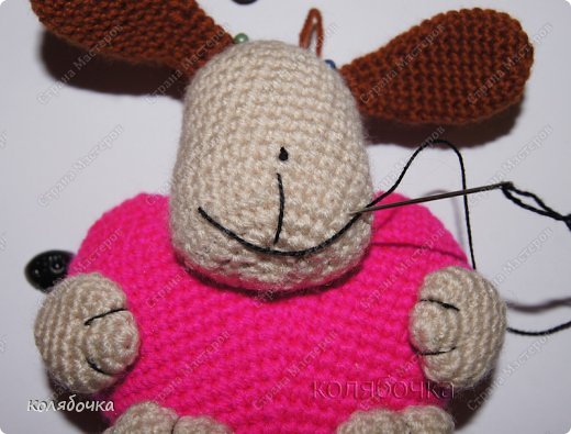 Пришиваем ушки, вышиваем носик, ротик, брови. При пришивании деталей оставшиеся концы нитей протаскиваем в отверстие в голове внизу, что бы в конце работы спрятать их в голову. Пришиваем бусинки глазки.