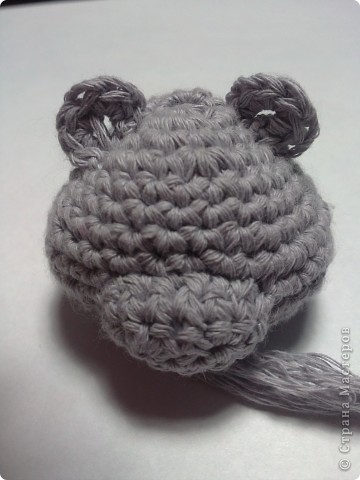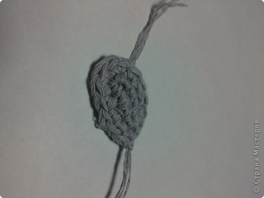 Мордочка. 1 - 5 воздушных петель, 2 столбика без накида в каждую петлю (= 10 ст) 2 - с двух сторон прибавляем по две петли, образуем овал (= 14 ст) Закрепляем нить и оставляем хвостик 20 см для сшивания.