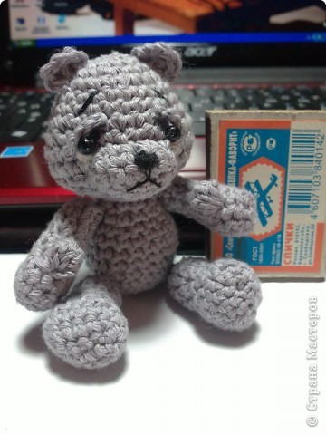 Пришиваем голову, в голову прячем все наши ниточки-хвостики. если слабо набили. можно добавить синтепона. размер медвежонка будет зависеть от номера крючка и толщины нити. Мой маленький, рядом стандартный спичечный коробок.