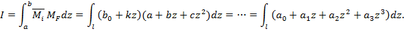 Это объясняется тем, что при воздействии на систему сосредоточенных сил, выражения для изгибающих моментов имеют линейную зависимость вида: M=b0+kz, а при воздействии, кроме указанных выше, так же и равномерно-распределенных нагрузок, выражения имеют квадратичную зависимость: M=a+bz+cz2. Графически эти зависимости отображаются соответственно наклонной прямой и квадратной параболой, и называются эпюрами моментов. Необходимо заметить, что в единичном состоянии эпюра моментов Таким образом, на каждом участке необходимо вычислить интеграл