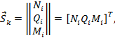 Установим зависимость между внешними нагрузками, приложенными к узлам ij и внутренним усилиям в стержне k. В левом сечении стержня возникают внутренние усилия Ni, Qi, Mi, которые мы объединим базовым вектором усилия для k стержня.