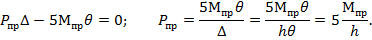 Рама нагружена распределенной нагрузкой P=30кН/м и сосредоточенной силой Р=90кН. Рама 5 раз статически неопределима, если решать методом сил, и 2 раза кинематически неопределима если решать методом перемещений. Раскрыв неопределимость, получаем эпюру М. Для получения механизма с одной степенью свободы необходимо поставить 5+1=6 шарниров. Пронумеруем сечения по степени убывания моментов. Загружаем механизм предельными моментами и предельными внешними нагрузками. Принимаем в качестве возможного перемещения угол поворота вертикальных стержней θ. Так как ригель не перемещается по вертикали, т.е. в направлении действия распределенной нагрузки, то она не совершает работы. Точка приложения сосредоточенной силы переместится по горизонтали на величину