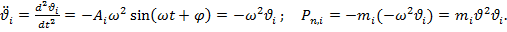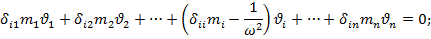 Исследуем это движение. Применим к движущейся системе принцип Даламбера, который позволяет заменить дифференциальные уравнения движения квазистатическими уравнениями равновесия. Приложим к каждой массе силу инерции Как видно, сила инерции пропорциональна массе перемещению и квадрату частоты. Вычислим перемещение по направлению степени свободы i массы, используя принцип суперпозиции: