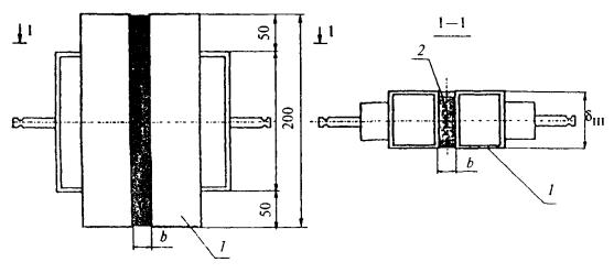 b - толщина шва; 1 - обойма из алюминия или нержавеющей стали толщиной 3 мм; 2 - образец испытываемого монтажного шва Рисунок 4 - Схема приспособления для испытания монтажных швов на деформационную устойчивость 0430S10-04736
