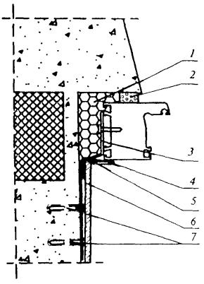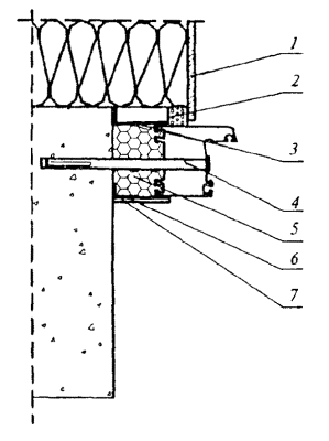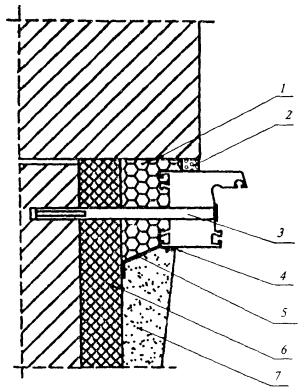 1 - элемент отделки наружного оконного откоса; 2 - изоляционная саморасширяющаяся паропроницаемая лента; 3 - водоизоляционная паропроницаемая лента; 4 - рамный дюбель; 5 - пенный утеплитель; 6 - пароизоляционная лента; 7 - декоративный нащельник Рисунок А.8 - Узел бокового примыкания оконного блока к проему стены из бетона с наружным утеплением фасада и установкой внутреннего декоративного нащельника 0430S10-04736