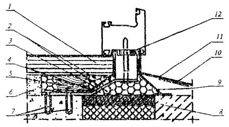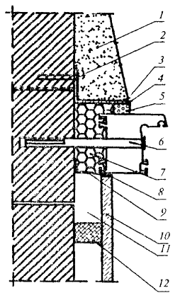 1 - подоконная доска; 2 - пенный утеплитель; 3 - пароизоляционная лента; 4 - гибкая анкерная пластина; 5 - опорная колодка под подоконную доску; 6 - штукатурный раствор; 7 - дюбель со стопорным шурупом; 8 - вкладыш из антисептированного пиломатериала; 9 - водоизоляционная паропроницаемая лента; 10 - шумопоглощающая прокладка; 11 - слив; 12 - изоляционная саморасширяющаяся паропроницаемая лента Рисунок А.4 - узел нижнего примыкания оконного блока, подоконника и слива к проему слоистой стены с эффективным утеплителем 0430S10-04736
