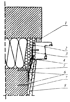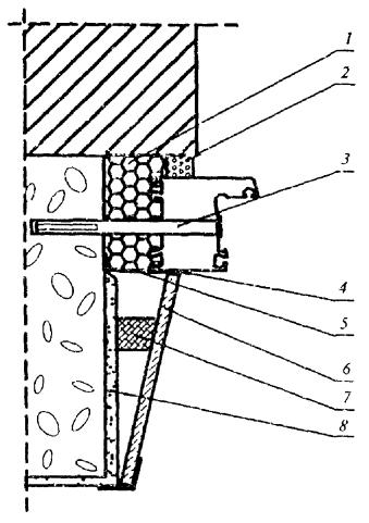 1 - изоляционная саморасширяющаяся паропроницаемая лента; 2 - пенный утеплитель; 3 - гибкая анкерная пластина; 4 - герметик; 5 - пароизоляционная лента; 6 - дюбель со стопорным шурупом; 7 - штукатурный слой внутреннего откоса (с фаской для слоя герметика); 8 - армирующая сетка Примечание - В том случае если теплотехнические расчеты не подтверждают требуемую температуру поверхностей внутренних откосов, рекомендуется применение оконных блоков с расширенной коробкой или увеличение размеров наружной четверти при помощи конструкционных материалов Рисунок А.3 - Узел бокового примыкания оконного блока к проему с четвертью слоистой стены из кирпича с эффективным утеплителем и отделкой внутреннего откоса штукатурным раствором 0430S10-04736