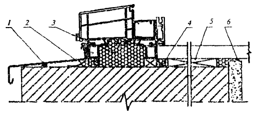 1 - шумопоглощающая прокладка; 2 - водоизоляционная паропроницаемая лента; 3 - пенный утеплитель; 4 - пароизоляционная лента; 5 - несущая опорная колодка; 6 - герметик Рисунок А.12 - Монтажный шов в нижнем узле примыкания оконной коробки, подоконника и отлива в проеме однослойной стены 0430S10-04736