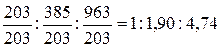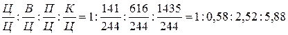 Для выражения состава бетона по объему определим предварительно объемы материалов в рыхлонасыпном состоянии: Vц = Ц/ρ н.ц. = 244/1, 2 = 203 дм3 Vп = П/ρ н.п = 616/1, 6 = 385 дм3 Vк = К/ρ н.к = 1435/1, 49 = 963 дм3 Состав бетона по объему в относительных единицах: