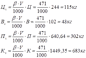 Объем бетона, полученного в одном замесе бетономешалки вместимостью 750 дм3 равен β *V = 0, 628· 750= 471дм3.
