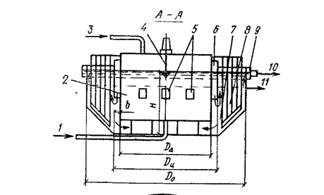 Окситенк: 1 – подача осветленной сточной воды; 2 – реактор; 3 – подача технического кислорода; 4 – механический аэратор; 5 – выпускные окна; 6 – воздухоотделитель; 7 - илоотделитель; 8 – перемешивающее устройство; 9 – водосборный лоток; 10 – выпуск очищенных сточных вод; 11 – выпуск избыточного активного ила