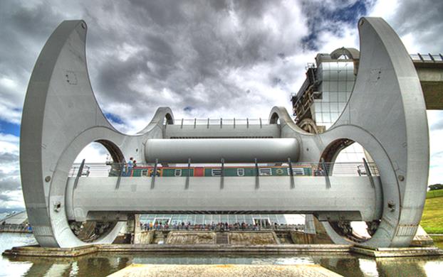 Наиболее интересным из них является первый в мире вращающийся судоподъемник, соединяющий каналы Форт-Клайд и Юнион. В честь соседнего города Фолкерк в центральном районе Шотландии его назвали Фолкиркское колесо (англ. Falkirk Wheel). Канал, соединяющий Северное море с Атлантическим океаном (Глазко и Эдинбург), был построен еще в XVIII веке. В районе Фолкирка для преодоления большого перепада высот он проходил через каскад из 11 шлюзов, протянувшийся на полтора километра. Однако в 30-е годы прошлого века шлюзы были разрушены и засыпаны, и сквозное сообщение по каналу стало невозможным. В 1998 году было принято решение запустить «Миллениум Линк» – проект возобновления судоходства по каналам Шотландии, соединив Глазго с Эдинбургом. Вместо восстановления старой громоздкой инженерной системы было решено создать проект в стиле XXI века. Рассматривались многочисленные варианты – от гигантского «чертова колеса» до поворотных площадок, однако после трехнедельной дискуссии ее участники остановились на принципе подъема-спуска судов. В настоящее время 50-километровый участок канала от Эдинбурга до Фолкирка заканчивается длинным акведуком, выход которого располагается на 35 метров выше бассейна, соединенного с проложенными до Глазго каналами. Суда преодолевают 35-метровый перепад уровней воды с помощью построенного в 1999–2002 годы «Фолкирк Вил» (Falkirk Wheel) – первого в мире «вращающегося» судоподъемника. Вращающаяся часть конструкции состоит из двух заполненных водой камер, в которых путешествие сверху вниз, а также снизу вверх в течение 15 минут одновременно могут совершить не менее восьми яхт и катеров среднего размера. Часть акведука длиной 150 метров проходит под землей по туннелю эллиптического сечения. Оригинальный дизайн сооружения рассчитан на привлечение туристов. Действительно, кроме выполнения транспортных функций, судоподъемник «Фолкирк Вил» стал настоящим водным аттракционом – каждый желающий, купив билет, может покататься на специальных автобусах-амфибиях, которые осуществляют подъем и спуск на Колесе. Проект также включает в себя центр для посетителей с магазинами, кафе и выставочным залом. Стоимость реставрации «Миллениум линк» составила 84, 5 млн. фунтов стерлингов из них на долю «Фолкирк Вил» пришлось 17 млн. £. Средства были получены с помощью ЕБРР, который по достоинству оценил инвестиционную привлекательность проекта. Следует отметить, что впервые подобная конструкция была предложена неким немецким инженером еще в самом начале XX века, но так и не была реализована, однако наследие – техническая мысль, было сохранено, о чем имеется свидетельство в материалах судоходного конгресса по судоходству 1912 года.