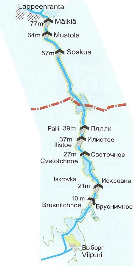 Большая часть новых шлюзов были построены рядом со старыми, поэтому многие старые шлюзы частично сохранились. Некоторые из них стали использоваться в качестве водосливных каналов. В результате характеристики судоходной трассы канала следующие: · длина: Ø общая протяженность – 57, 3 км (34 км – в России, 23, 3 км – в Финляндии); Ø сухопутной части – 42, 9 км (19, 6 км – в России, 23, 3 км – в Финляндии); Ø морского фарватера – 14, 4 км. · ширина – от 34 до 55 м; · глубина (наименьшая) – 5 м; · перепад уровней между озером Сайма и Финским заливом – 75, 7 м. · Размеры камер шлюзов: Ø длина – 85, 0 м, Ø ширина – 13, 0 м, Ø глубина на пороге – 5, 2 м. На территории Финляндии расположены три шлюза: · Мялкия (Мялкиа) Mä lkiä (12, 4 м) · Мустола Mustola (7, 2 м) · Соскуа Soskua (8, 3 м) На территории России — пять: · Пялли Pä lli · Илистое · Цветочное · Искровка · Брусничное Самый большой шлюз – Мялкия, перепад уровня – 12, 4 м. Самый маленький шлюз – Цветочное, перепад уровня – 5, 5 м.
