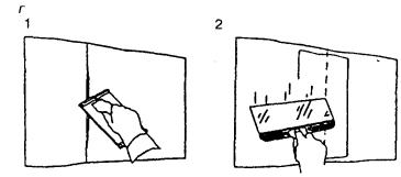 Рисунок 46 - Последовательность операций по заделке больших пробоин в ГКЛ 6.9.12 Для устранения пузырей (рисунок 47) на стыках ГКЛ их надрезают в ленте (рисунок 47, 1) с помощью универсального ножа, а мелкие пузыри ликвидируют, отрезая и удаляя образующую их ленту, после чего наполняют пузырь шпаклевкой, погружают участки ленты, образующие пузырь, в шпаклевку с помощью шпателя и разравнивают (рисунок 47, 2). Через 24 ч заделанную поверхность обрабатывают способом, изложенным в 6.9.4.