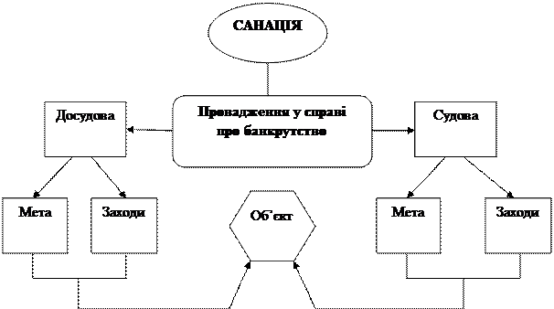 Одним із головних питань антикризового менеджменту є питання фінансового оздоровлення підприємств – санації. Законом[12] визначені два терміни: санація та досудова санація, які відрізняються часом проведення оздоровчих заходів як до порушення провадження у справі про банкрутство, так і під час провадження у справі, і кінцевою метою здійснення заходів (у визначенні санації підкреслюється, що метою проведення санаційних заходів є не тільки запобігання визнанню боржника банкрутом, а також і задоволення вимог кредиторів, а визначення досудової санації не виділяє задоволення вимог кредиторів як окрему мету, а за мету санації ставить запобігання ліквідації підприємства).