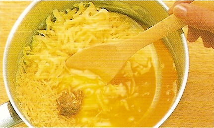 2.Растопите сливочное масло в сотейнике, добавьте муку и обжаривайте непрерывно перемешивая 2 минуты пока мука не подзолотится. Не переставая помешивать тонкой струйкой влейте молоко, доведите до кипения и варите на медленном огне пока не загустеет. Дайте покипеть ещё 1 минуту и уберите с огня. Добавьте сыры, горчицу и желтки от 3 яиц, перемешайте и разложите по формочкам.