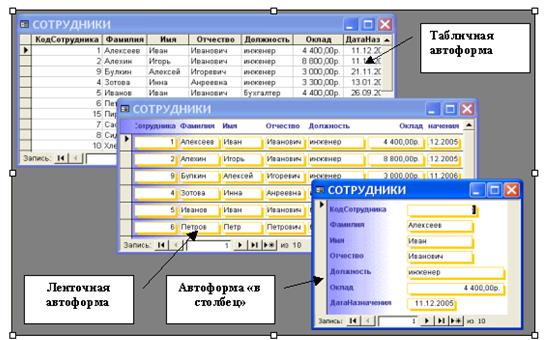 Формы позволяют пользователям вводить данные в таблицы базы данных без непосредственного доступа к самим таблицам. Автоформы. Это средство автоматического создания форм. Автоформа всегда создается на базе только одной таблицы и содержит все поля этой таблицы. Существует три вида автоформ: «в столбец», ленточные и табличные (рис. 26). Автоформа «в столбец» отображает поля только одной записи, ленточная» автоформа отображает одновременно группу записей, табличная автоформа по внешнему виду ничем не отличается от таблицы, для которой она создана.