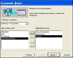 Рис. 26. Три вида автоформ. Для создания автоформы следует открыть панель Формы в окне База данных и воспользоваться командной кнопкой Создать. В открывшемся диалоговом окне Новая форма выбирают тип автоформы и таблицу (или запрос), на которой она основывается. После щелчка на кнопке < ОК> автоформа формируется автоматически. Создание форм с помощью мастера. Мастер форм – специальное средство, создающее структуру формы в режиме диалога с разработчиком. В режиме Мастера форм можно создать форму, базирующуюся как на одной, так и на нескольких таблицах. Можно выбрать нужные поля для включения в форму. Этот режим создания формы является более гибким по сравнению с режимом создания Автоформы. Мастер форм можно запустить из окна База данных щелчком на значке Создание формы с помощью мастера на панели Формы. Создание формы выполняется в несколько этапов: