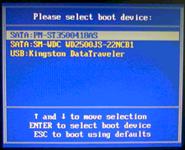 Мал.- 1 вибір пристрою завантаження • через меню вибору пристрою завантаження (є не на усіх комп'ютерах). Як правило, меню вибору активується шляхом утримування під час запуску клавіші F8 (треба відразу після запуску комп'ютера натиснути і утримувати або часто натискати клавішу F8). У ноутбуках замість F8 може використовуватися яка-небудь інша клавіша (F10, F2 або ін.). Вікно вибору найчастіше є списком пристроїв на синьому фоні (див. скріншот). Щоб вибрати серед них той, з якого треба завантажити комп'ютер, треба виділити його в списку (перемістити на нього виділення за допомогою клавіш " Вгору" або " Вниз") і натиснути клавішу Enter.