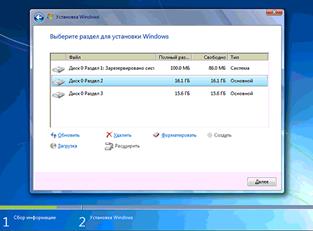Мал.- 4 розподіл жорсткого диску 1. Якщо Windows встановлюється на чистий жорсткий диск, необхідно створити логічний розділ для установки операційної системи (див. скріншот). Для цього треба натиснути " Налаштування диска", потім " Створити", в спеціальному полі вказати розмір логічного розділу (не менше 16000 MB) і натиснути кнопку " Застосувати" (див. скріншот). Після цього в незайнятому дисковому просторі, що залишився, аналогічним чином створюємо ще один або декілька логічних розділів (на ваш розсуд). Розподіливши увесь дисковий простір, треба виділити в списку розділ, призначений для установки Windows, і натиснути " далі" (див. скріншот) 2. Якщо здійснюється переустановка Windows і жорсткий диск комп'ютера вже розбитий на розділи, треба: • або по черзі видалити їх усі (виділити розділ, натиснути " Налаштування" і потім " Видалити") і перерозподілити простір наново вказаним вище способом. При цьому, уся інформація, що міститься на комп'ютері, буде втрачена; • або просто обрати відповідний розділ для установки, відформатувати його (натиснути " Форматувати") і продовжити установку Windows, натиснувши кнопку " Далі". Як вже говорилося, розмір розділу для установки має бути не меншим 16 ГБ (близько 16000 МБ). Після форматування уся інформація на ньому буде видалена. Зате файли, що знаходяться на інших дисках, не постраждають. Далі почнеться процес копіювання файлів на жорсткий диск комп'ютера і їх розпаковування, який може тривати достатньо довго (усе залежить від швидкодії комп'ютера).
