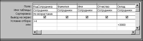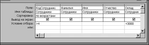 Рис. 33. Пример записи условий отбора в запросе. В случае записи условий отбора так, как показано на рисунке 34, будут отбираться записи из таблицы СОТРУДНИКИ, для которых значение в поле КодСотрудника больше 4, или записи, для которых значение в поле Оклад меньше 3000, а также записи, для которых справедливы оба условия отбора.