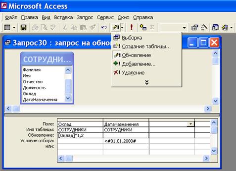 Пример. Требуется создать запрос на обновление, после выполнения которого в таблице СОТРУДНИКИ будут увеличены на 20% оклады сотрудников, принятых на работу до 01.01.2000. При заполнении бланка запроса включаем в него поля Оклад и Дата назначения из таблицы СОТРУДНИКИ. Для поля Оклад в строке Обновление вводим правило обновления: [Оклад] * 1, 2 Для поля Дата назначения в строке Условие отбора вводим условие: < 01.01.2000 (рис. 44). В результате выполнения этого запроса в таблице СОТРУДНИКИ будут изменены значения в поле Оклад в тех записях таблицы, для которых значение в поле Дата назначения меньше 01.01.2000.