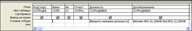 - Выберите поля, включаемые в запрос, и задайте условия отбора записей. В строке Условие отбора для поля ДатаНазначения введите условие: Between 01.01.2004 And 31.12.2004. Для поля Должность введите условие на ввод параметра: [Введите название должности]