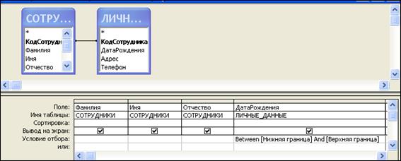 - Выберите поля, включаемые в запрос, и задайте условия отбора записей. В строке Условие отбора для поля ДатаРождения введите условие: Between [Нижняя граница] And [Верхняя граница]