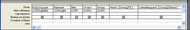 - Выберите поля, включаемые в запрос. В новом поле бланка запроса в строке Поле введите формулу Налог: [Оклад]*0, 1. В следующем поле введите формулу СуммаКвыдаче: [Оклад]-[Налог]