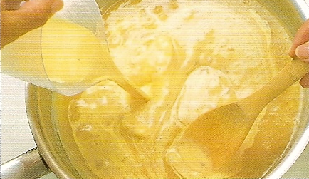 Выньте и положите на салфетку. 3. Муку с перцем, которая осталась высыпьте в сковороду и непрерывно помешивая влейте бульон и лимонный сок. Не переставая помешивать доведите до кипения.