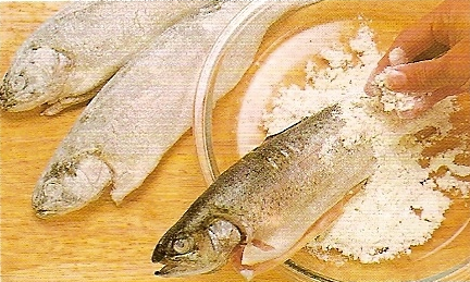 Смешайте муку, перец, укроп и сухую горчицу. 2.Натрите рыбу лимонным соком и окуните в мучную смесь так, чтобы форель была хорошо покрыта.