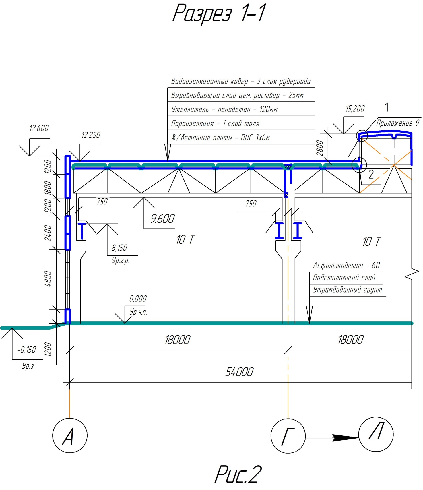 Выполнить общий архитектурно-строительный чертеж производственного здания по обшей для всех схеме и заданному варианту задания по таблице вариантов заданий. Производственное здание одноэтажное, прямоугольной формы. Размеры корпуса в плане 54х60 м. Здание трехпролетное. Оборудовано мостовыми кранами (в каждом пролете) грузоподъемностью 10 т. В качестве несущих конструкций использовать железобетонные колонны прямоугольного сечения или двухветвевые согласно данным таблицы вариантов, которые устанавливаются на отдельные железобетонные фундаменты. Расстояние между осями крайних колонн принять равным 6 м. Это расстояние называют шагом. Шаг средних колонн (зависящий от данных таблицы вариантов) может быть равен 6 или 12 м. Поперёк здания несущие колонны размещать на расстоянии 18 м. между осями. Это расстояние называют пролетом. Так как длина стеновых панелей 6 м., то между колоннами с шагом 18 м. ставятся фахверховые колонны. Это колонны прямоугольного сечения, на которые навешиваются только стеновые панели, поэтому у них сечение меньше, чем у других колонн. Шаг фахверковых колонн принять равный 6 м. Размер их в поперечном сечении 300х300 мм. На колоннах предусмотрены выступы (консоли), на которые опираются подкрановые балки. Расстояние от разбивочной оси ряда колонн до оси подкранового рельса 750 мм. На колонны через 6 м устанавливается стропильные фермы или балки (в зависимости от данных таблицы вариантов). Высота средних колонн при шаге 12 м меньше, чем крайних, поэтому, чтобы фермы или балки были в горизонтальном положении, применяют подстропильные фермы. Они служат опорой для стропильных ферм, которые располагаются на расстоянии 6 м. друг от друга. На стропильные фермы (балки) укладывают настил из крупноразмерных железобетонных плит ПНС 3х6 м. Состав покрытия представлен на рис 2. В качестве наружных стен принимаются панели толщиной 240 мм., длиной 6 и 6, 25 м (угловые), высотой 1, 2 м. и 1.8 м. Высота цокольной и парапетной панелей 1, 2 м. Между осями " 3", " 4" и " 8", " 9" запроектировать раздвижные ворота размером 4, Ох4, 2 м. Для въезда транспорта возле ворот устраивается пантус 3х6 м. Дневное освещение, помимо светоаэрационного фонаря, который располагается вдоль среднего пролёта, осуществляется посредством ленточного остекления высотой 1.20 или 1, 80 м по периметру здания. Отвод атмосферных осадков осуществляется через внутренние водоотвод, состоящий из воронок, вмонтированных в кровле здания, и ливнесточных труб, соединяющих водосборные воронки с ливневой канализацией. По периметру здания устраивается асфальтовая отмостка шириной 1.5м.