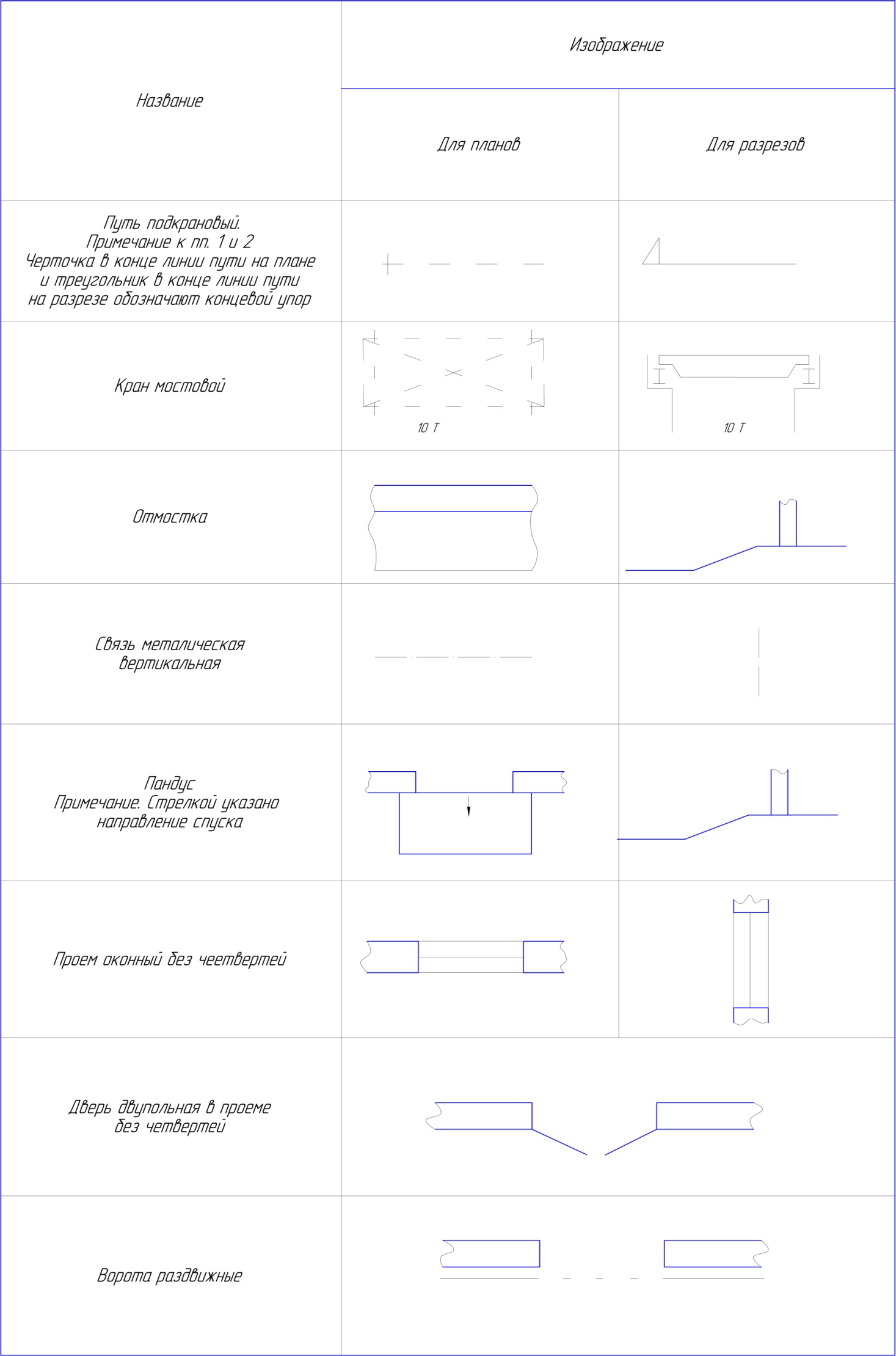Построение фасада производят в такой последовательности: наносят координационные оси, проходящие в характерных местах фасадов - крайние, у одной из сторон каждого проема ворот; чертят общий контур здания (длину берут с плана, а высотные размеры с разреза); показывают расположение окон, ворот (дверей); вычерчивают оконные переплеты с указанием (графически) способа и направления открывания оконных переплетов; прочерчивают швы между панелями. На чертежах фасадов производственных зданий наносят марки заполнения оконных проёмов. Штриховкой выделяют участки стен, выполняемые из материла, отличающегося от материала всего фасада здания (кирпич изображается на фасадах горизонтальной штриховкой). Размеры на чертежах фасадов не наносят. Справа на чертежах фасадов или слева от изображения фасада проставляют отметки высот - уровня земли, цоколя, низа и верха проемов, парапета, верха кровли. Основанием чертежа фасада служит утолщенная линия толщиной 1‚2-1‚5 мм. После проверки соответствия фасада с планом и разрезом производят окончательную обводку всех элементов фасада тонкими линиями толщиной 0‚4-0‚5 мм. Пример выполнения фасада приведен на рис.5. Размеры и состав граф спецификации и ведомостей даны в приложении 5. Располагают спецификации вплотную к правой рамке чертежа (над основной надписью). Пример оформления спецификаций и ведомостей приведён, в приложениях 6 и 7. Условные изображения некоторых элементов зданий изображены в приложении 8.