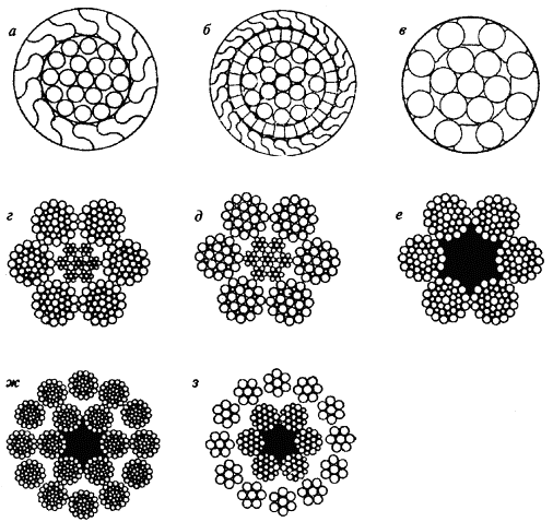 Рис.6. Канаты проводниковые эксплуатационных и проходческих подъемов: а - по ГОСТ 3090-73; б - по ГОСТ 7675-73; в - полузакрытые; г - по ГОСТ 7669-80; д - по ГОСТ 7667-80; е - по ГОСТ 7668-80, ТУ 14-4-1444-87; ж - по ГОСТ 16827-81; з - по ГОСТ 16828-81.