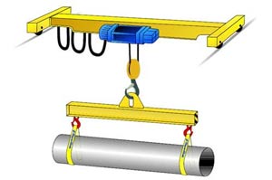 Грузоподъемные траверсы предназначены для подъема подкрановых балок вместе с тормозной конструкцией, которые состоят из захвата, распорки и стропа. С помощью штыря закрепляют захват к подкрановой балке. После установки подкрановой балки в проектное положение штырь убирают. С помощью крюков к тормозной площадке крепят траверсы грузоподъемные. Т.е., когда необходимо устранить влияние горизонтальных сил, действующих на груз, а также для подъема длинномерных грузов применяют стропы с траверсой.