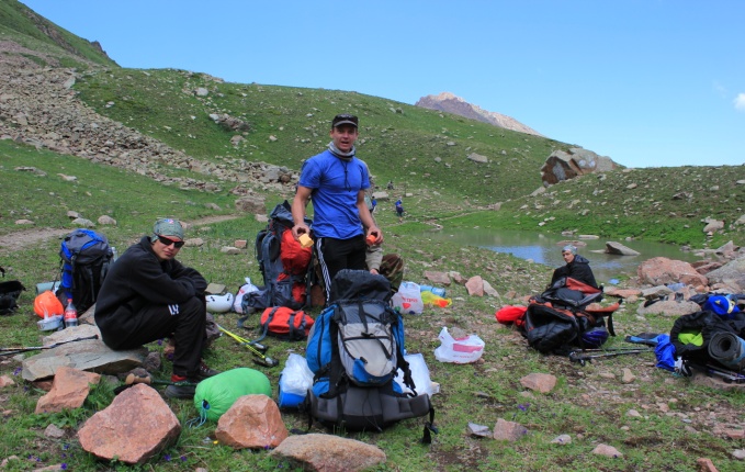 Близилось время обеда. Обед мы устроили на поляне Зимина, где в прошлом году у нас была ночевка на маршруте 1 к.с. Конечная станция канатной дороги – Талгарский перевал находился совсем рядом, поэтому мимо нас проходило большое количество туристов, что немного напрягало. Шел уже 3 день похода, но не было ощущения, что мы уже прилично прошли. По сути, мы пока наматывали круги по соседним ущельям, а вся прелесть маршрута заключается в том, что ты уходишь далеко от людей и остаешься наедине с природой. Так бы мы и ходили еще пару дней вокруг, если бы пошли на перевалы Пионер и Маншук Маметовой. Но на спусках в Левый Талгар уже начинается настоящая дикая природа, где редко встречаются люди. Обед у нас на этот раз был более сытным, как и обещали Арман с Альбиной. Помимо привычного бутерброда, каждый себе заварил ролтон, а также мы открыли банку сайры, которую я себе сразу же добавил в бичпакет и ел уже полюбившуюся в походе уху. После такого обеда уже каждый мог смело заявить о том, что наконец-то наелся.