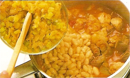 поперчите и оставьте потомиться не накрывая крышкой на медленном огне минут 10. 3.Затем увеличьте огонь, добавьте в соус ранее зажаренное мясо и размоченную фасоль, накройте крышкой и оставьте томиться на медленном огне 1 час.