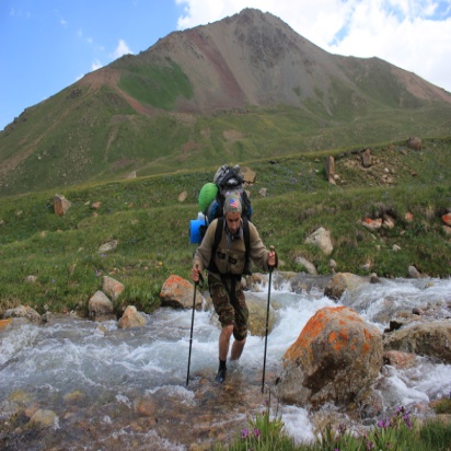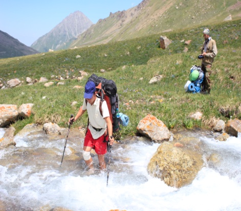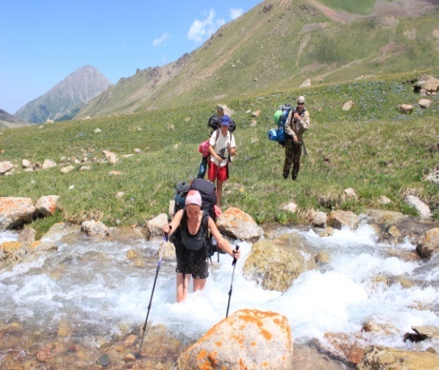 Реку как всегда я перепрыгнул по камешкам, а Саша еще долгое время ходил в поисках более оптимального места перехода, и в конце концов, перешел на нашу сторону. Когда Саша дошел до нас, он сказал, что дальше идти не может, колено сильно разболелось. Было как раз время обеда. Обед был традиционным, без бичпакетов и сайры. После обеда было решено отдохнуть немного у речки, а чуть позже уйти немного выше и встать на ночевку. Под перевал уже не было идти смысла. Так наступила незапланированная по графику дневка. Под перевал в тот день мы так и не подошли. Но я уже не был удивлен, ведь со 2 дня у нас что-то постоянно шло не так, как было запланировано. Но здоровье участников важнее, а время в запасе у нас еще было. Чуть выше, буквально через 1, 5 перехода мы встали на ночевку. Уже был вечер, погода была идеальная, без единого облачка. Место для ночевки мы выбрали вполне удачное, ровное и в 2 метрах от ручья. В связи с незапланированной дневкой и небольшого отставания от намеченного графика, подъем на 7 день снова был назначен на 3 утра для дежурных и на 4 для всех остальных. Дежурными в этот раз были снова мы с Яшей и данный фактор совершенно не радовал. По количеству перевалов и по расстоянию уже был пройден маршрут 1 к.с. Теперь уже начиналась настоящая двойка, пол маршрута еще было впереди, и поэтому расслабляться было рано. Жене с Яшой уже начинало хотеться пойти домой. Яша вспоминал про родителей, которые у него в Шымкенте и отметил, что именно в такие моменты начинаешь действительно скучать по дому, по родне, ведь в городе со всей этой суетой, работой не задумываешься о таком важном в жизни, как семья. Женя очень скучал по своей Анютке, которая ждала его с нетерпением в городе. Арману с Альбиной не пришлось скучать друг по другу, ведь на маршруте мы шли все вместе. Я тоже скучал по своей маме, сестре, зятю, но в город совершенно не рвался. Напротив, мне хотелось провести в горах как можно больше времени и пройти как можно больше перевалов. Я бы остался в горах и на месяц, если бы мне представился такой шанс. Перед сном мы немного поиграли в карты и легли спать. День 6 прошел спокойно и непринужденно.