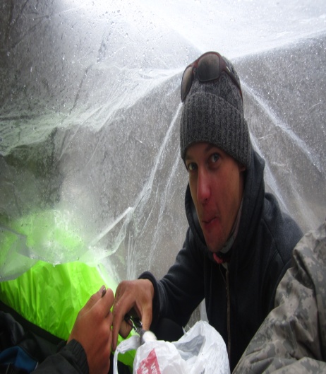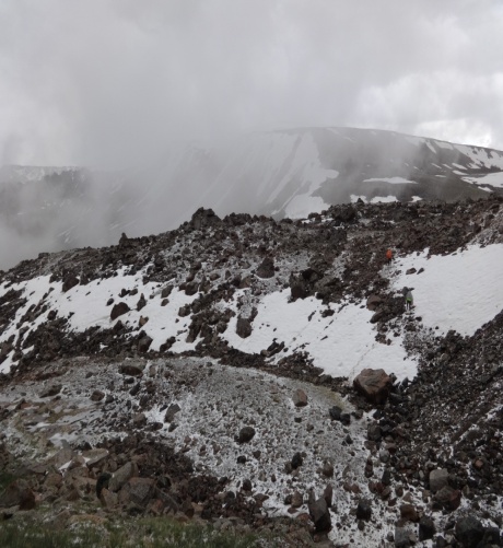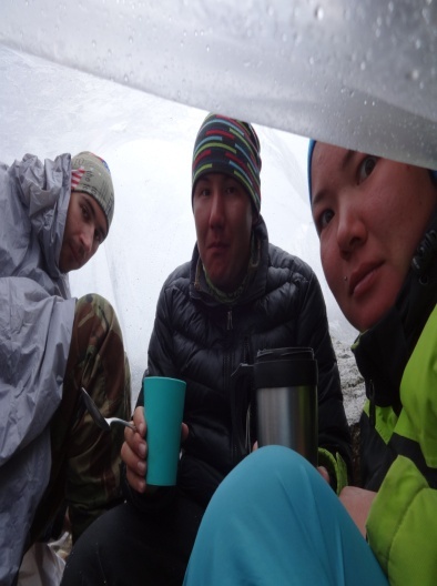 День 8 На 8 день подъем у нас был в 5.00. Небо было ясным, вокруг лежало много снега, и было очень красиво. Вечером я потерял батарейку от своего маленького фотоаппарата, поэтому надежда теперь была только на зеркалку. Но и с ней у меня произошел казус: во время завтрака батарейка упала в кашу, и весь заряд батареи мигом разрядился от влаги. Батарейки от обоих фотоаппаратов я изымал по вечерам, чтобы они не замерзали, ведь от этого заряд батареи быстро садится. В итоге, я к середине маршрута остался сразу без обоих фотоаппаратов, что меня очень расстроило. Альбинин фотоаппарат тоже сел, но к счастью Женя тоже был с фотоаппаратом, теперь фото для отчета делал он. Какой-то проклятый перевал Теплофизиков, - подумал я. Уже 2 год подряд мы не можем подняться туда без приключений, то погода нам мешает, то еще что-то. День у нас предстоял боевой. Мы планировали подняться на перевал Теплофизиков, спуститься с него и если успеем взять еще перевал Осыпной. Но с самого утра у нас была та же картина, что и в предыдущий день: Альбина с Арманом шли медленнее всех и постоянно отставали по причине Альбининой скользкой обуви. А за ночь нападало много снега, и камни были еще более скользкими, а снег местами глубокий. Да и подъемы были хорошими, поэтому легко не было ни кому. Места вокруг просто завораживали, как я жалел о том, что остался без фотоаппаратов. Чем выше мы поднимались, тем живописнее было вокруг, уже было видно киргизские горы и множество ледников, которые напоминали чупачупсы. На подходах к перевалу участники снова разбежались кто куда. Денис с Яшей зачем-то решили пойти левее вдоль скального выступа. Яша затем вовремя ушел ниже, а вот Денис решил пройти вдоль скалы, о чем впоследствии пожалел, т.к. там было довольно круто и опасно. Женя поступил разумнее и продолжил путь по морене вверх, его путь в конечном итоге оказался наиболее оптимальным. Все остальные ребята последовали за ним.