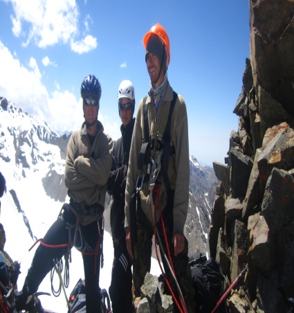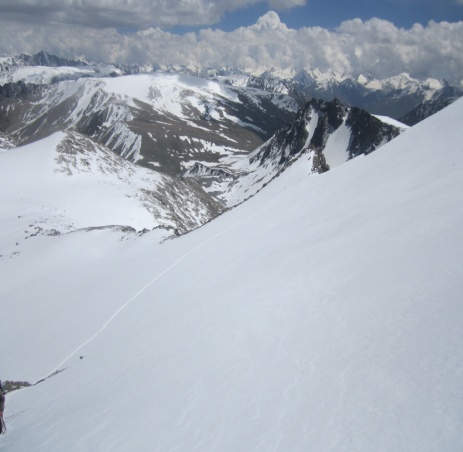 Время обеда мы уже прозевали, спуститься должны были с перевала под ужин. Поэтому мы и решили устроить обед вместе с ужином в одно время. Спускались с перевала мы также в связке, т.к. шли вниз по леднику, где периодически бывают трещины. Спуск был обманчивым, казалось, что можно спуститься максимум за 30 минут, а на самом деле спуск предстоял долгий и изнурительный. Приходилось тропить, местами мы проваливались по колено в снег. Особенность хождения в связке заключается в том, что каждый участник должен идти вслед друг за другом. Поэтому если кто-то начинает отставать или наоборот, идти слишком быстро, нарушается баланс. Здесь уже и не отдохнешь лишний раз, а каждый шаг нужно делать осторожно, чтобы случайно не скинуть камень или еще что-то на своего товарища. Зато и в связке есть свои преимущества касательно безопасности. Если вдруг кто-то из участников провалится в трещину или сорвется на льду, его могут удержать остальные участники, идущие с ним в одной связке. Когда мы спускались с перевала Теплофизиков в ущелье Правый Аксай, в трещину к счастью никто не провалился. Но зато, каждый из нас, ни раз проваливался по колено в снег, который местами был обледеневшим, поэтому мы с Арманом даже пару раз отбили себе лодыжку. Спуск отнял у всех много сил, в прочем, как и в прошлый раз. Ноги у всех промокли насквозь, не спасали даже фонари, снег с легкостью просачивался через них в ботинки. Но ноги были настолько привыкшими, что даже не чувствовали холод.