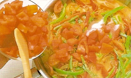 накройте крышкой и оставьте на среднем огне 5 минут. 2. Непрерывно помешивая посыпьте шинкованный перец мукой. Положите обратно бекон, добавьте помидоры, сахар, вино, уксус, бульон и доведите до кипения.